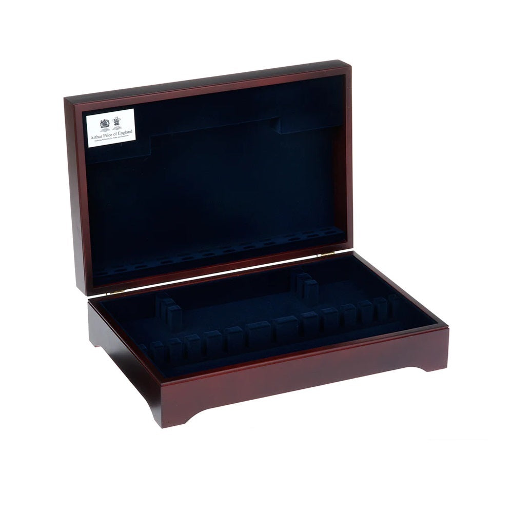 The Arthur Price UNIVERSAL Cutlery Canteen is a versatile canteen that will hold up to 12 x 10-piece place sets and 4 serving spoons. Mahogany wood finish with dark blue interior.