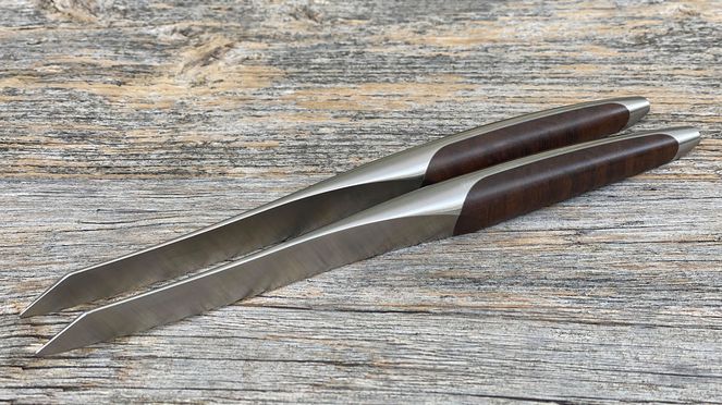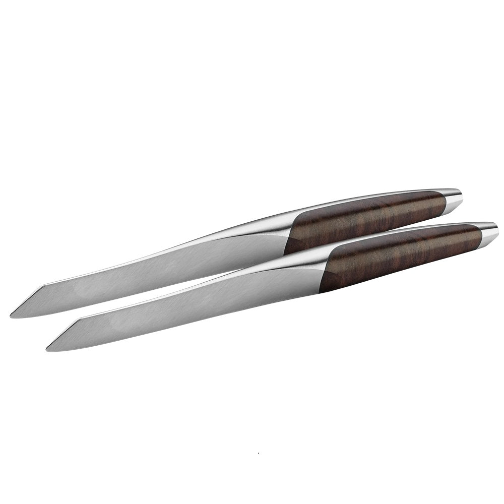 Steak Knife Walnut. The steak knife is a handcrafted masterpiece. The blade of the thought out design of the steak knife is contactless on the table. The noble handle made of stabilized wood makes it an eye-catcher on every table.