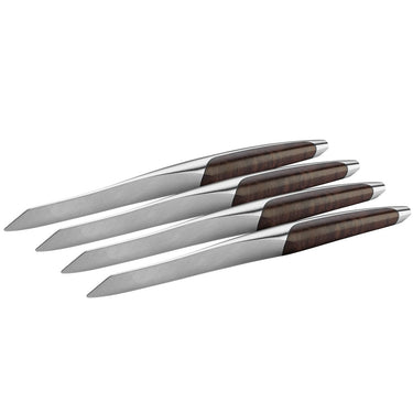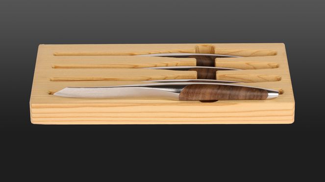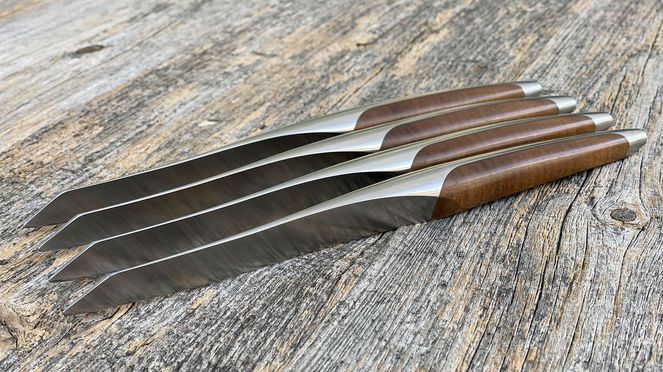 Steak Knife Walnut, Set of 4. The steak knife is a handcrafted masterpiece. The blade of the thought out design of the steak knife is contactless on the table. The noble handle made of stabilized wood makes it an eye-catcher on every table.