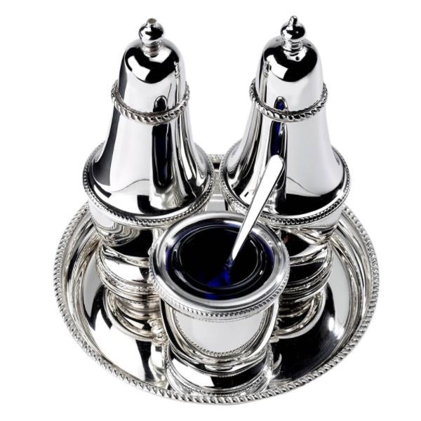 Resplendently tall silver plated Condiment Set, with tray. Bringing extra class and sophistication to your dining table.