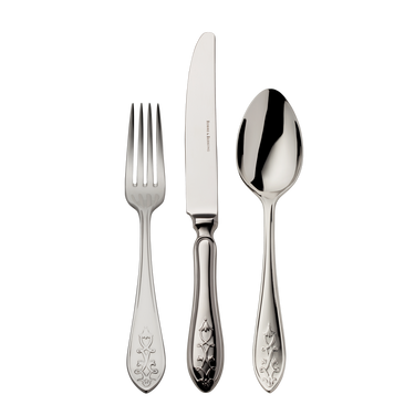 Delight in the captivating charm of Jardin stainless steel cutlery, featuring gracefully curved lily-shaped handles adorned with intricate floral motifs. Designed for Robbe & Berking by the visionary Robert Berking, this collection harmoniously merges elegance and nature, creating a captivating aesthetic.