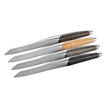 Steak Knife, Mixed Set of 4. The steak knife is a handcrafted masterpiece.This set of 4 comes with an assortment of handle materials: Ash black, grey, light and walnut. A wonderful collection that will give a splash of colour to your table setting.
