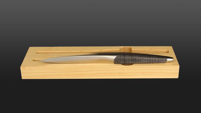 Table Knife Black Ash. The table knife is a handcrafted masterpiece. The blade of the thought out design of the table knife is contactless on the table. The noble handle made of stabilized wood makes it an eye-catcher on every table.