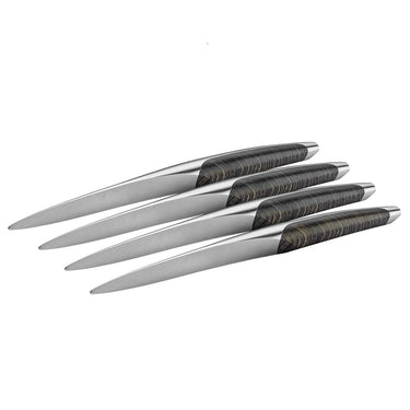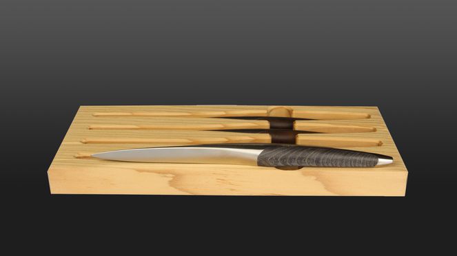 Table Knife Black Ash. The table knife is a handcrafted masterpiece. The blade of the thought out design of the table knife is contactless on the table. The noble handle made of stabilized wood makes it an eye-catcher on every table.