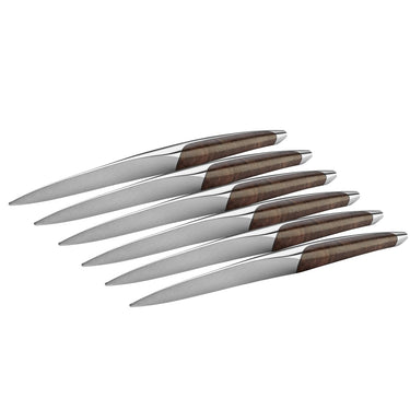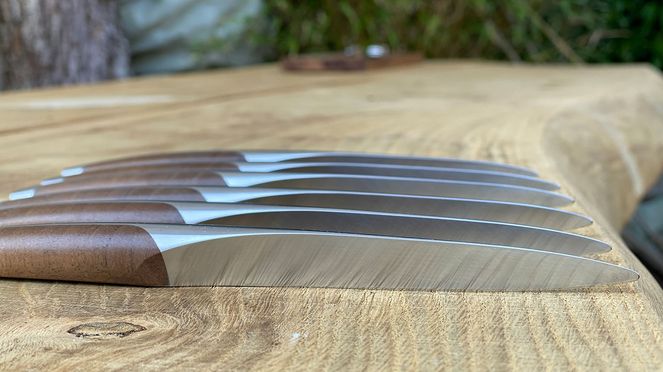 Table Knife Walnut, Set of 6. The table knife is a handcrafted masterpiece. The blade of the thought out design of the table knife is contactless on the table. The noble handle made of stabilized wood makes it an eye-catcher on every table.