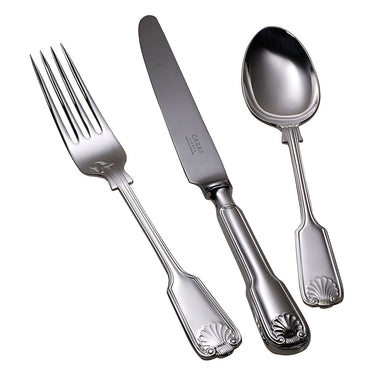 This charming cutlery set features the iconic Fiddle handles, adorned with extra embellishments of a delicate thread border and delightful shells on the head and heels. With its whimsical touch, it's sure to add an element of sophistication and elegance to any table setting, whether for a formal dinner or everyday use.