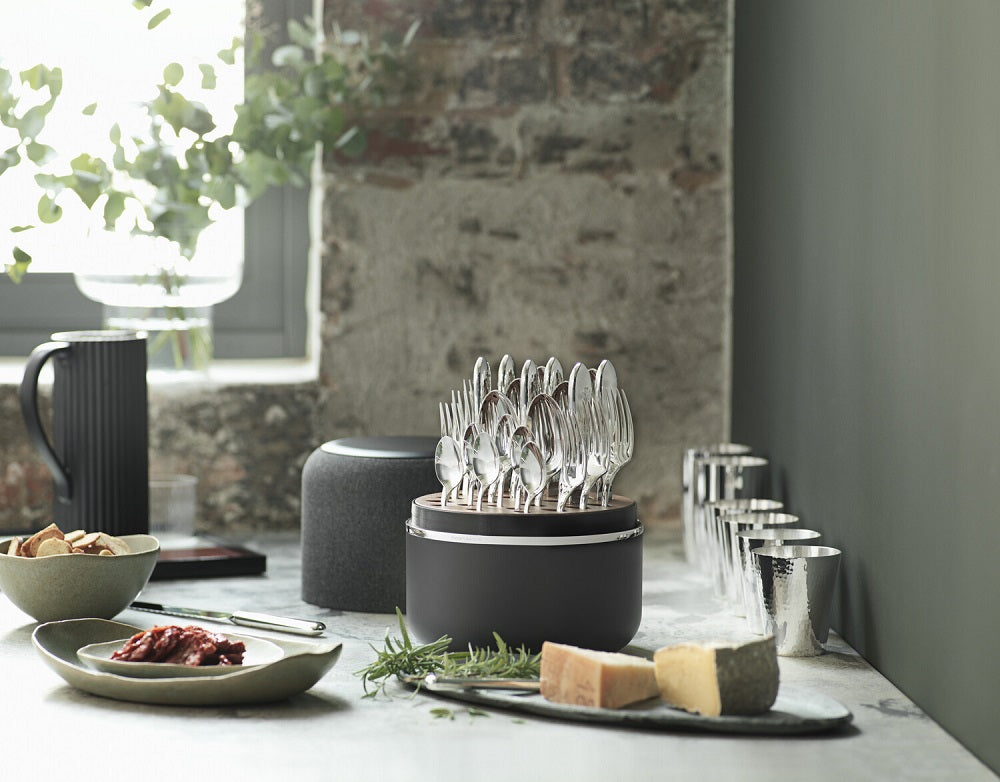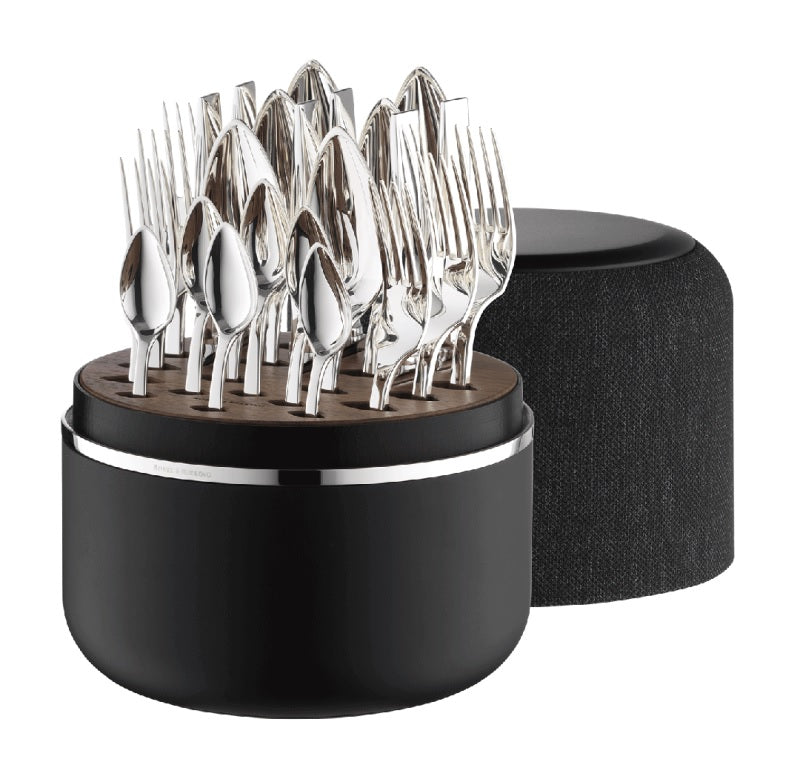 The box holds a 24-piece cutlery set in sterling silver from the Robbe & Berking Riva collection, with ‘shiny’ stainless steel blades (which will be delivered in the grey fabric box).