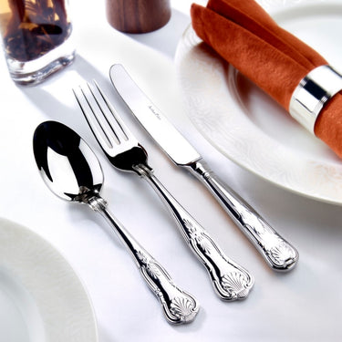Introducing Kings Everyday Stainless Steel Cutlery by Arthur Price - a classic and elegant pattern inspired by shells and honeysuckle from the early 1800s. This design is attributed to renowned silver-smithing brothers John and Henry Lias and is perfect for any formal occasion.