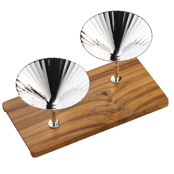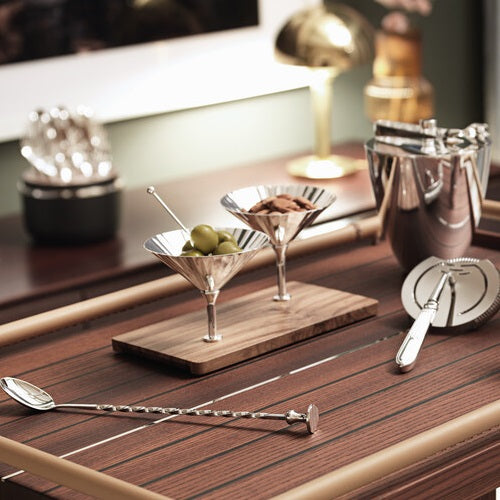 The silver snackbar from the Robbe & Berking "Belvedere" bar collection adds a touch of refinement to the art of snacking. Two miniature cocktail coupes are perfectly fitted to the wooden base; perfect for holding your favourite snacks in style.