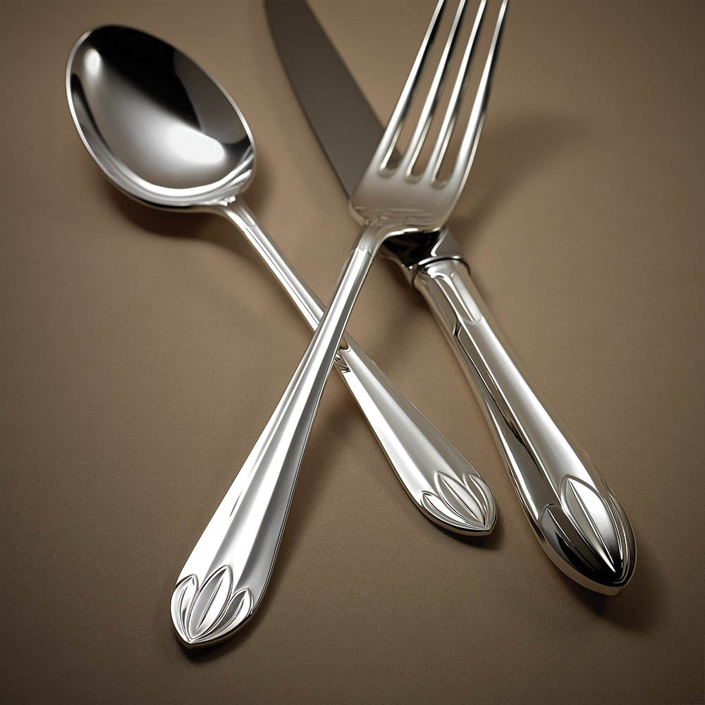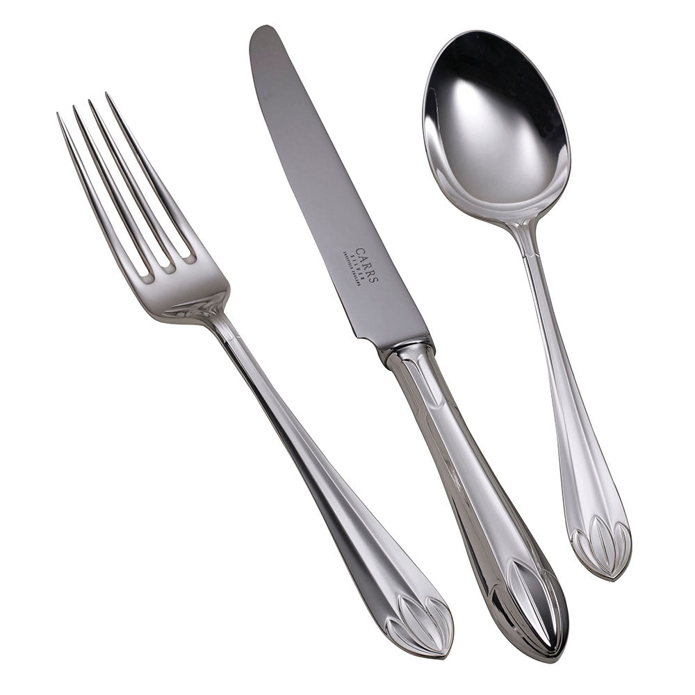 Lotus Flower is an Art Nouveau inspired cutlery design that showcases a stylized lotus flower sculpted at the tip of the handle. Originally designed in Sheffield for Walker & Hall in 1930, it has become a classic in the world of silverware and is now made to order for the Carrs Silver Plated Cutlery collection.