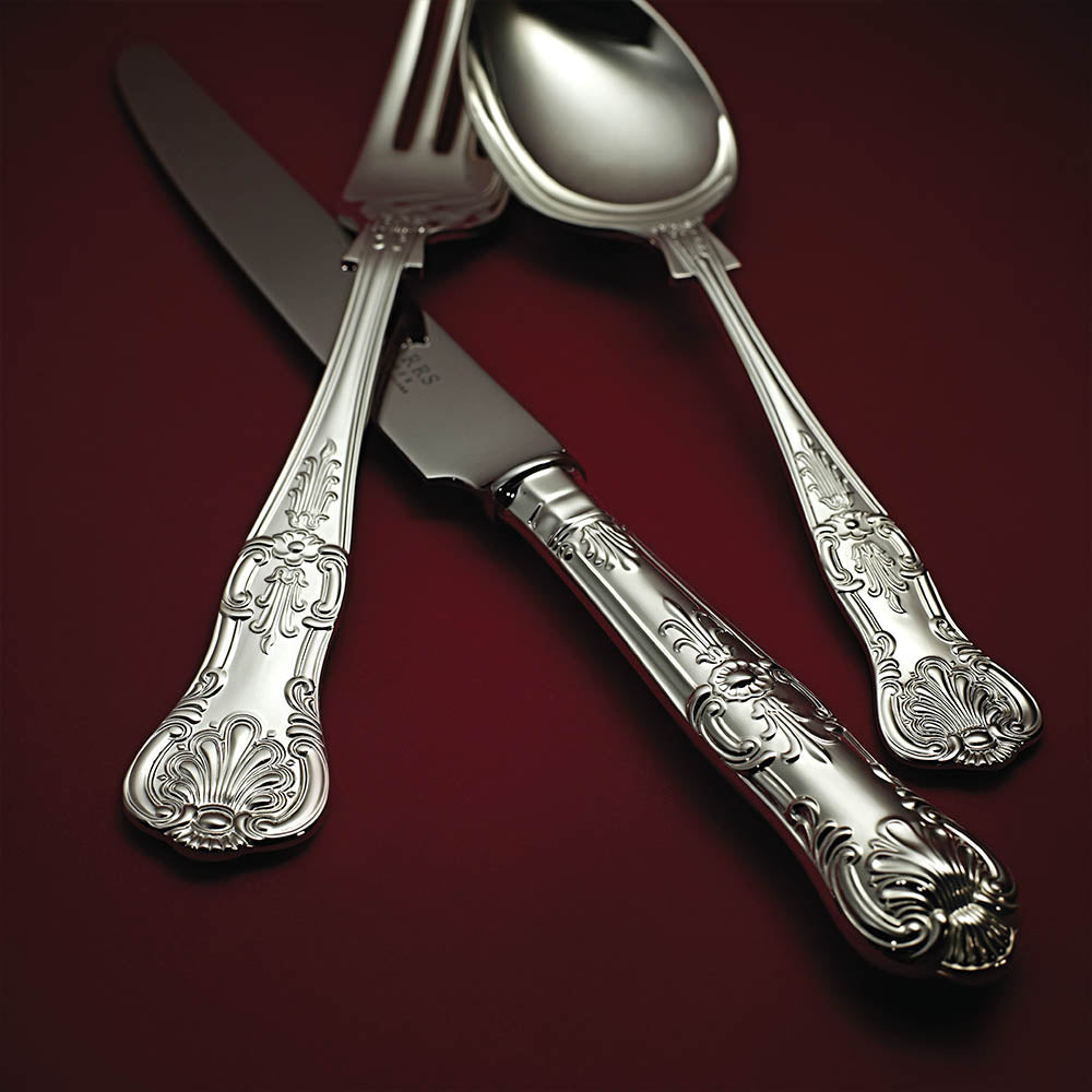 One of the most elaborate and extravagant patterns in the Carrs Silver Plated cutlery collection, Queens is a variation of the popular Kings pattern, created by John and Henry Lias in the 1830s, on the request of George IV for his consort.