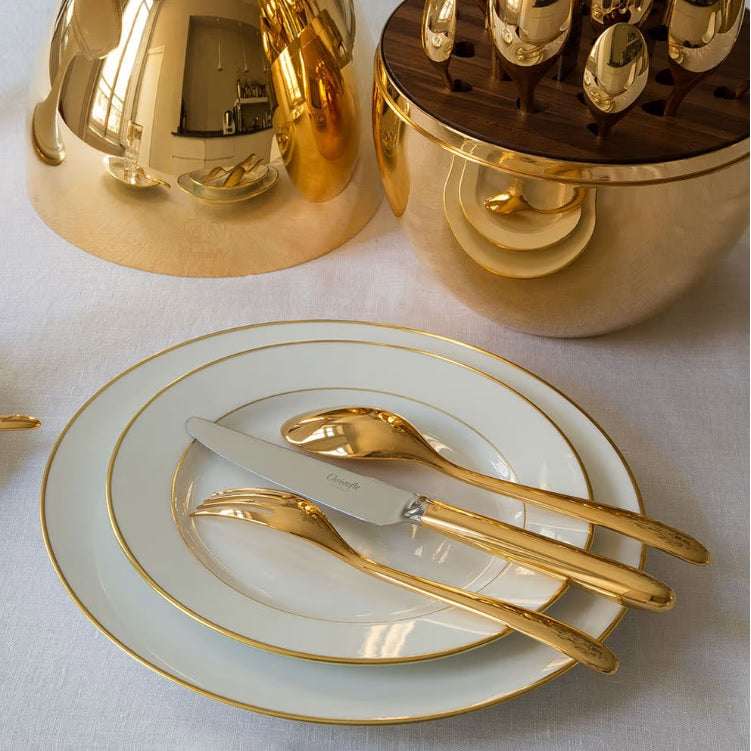 Handcrafted in France, the Mood Gold set exemplifies Christofle’s tradition of exceptional silversmithing. The gilded finish reflects light with a warm, inviting glow, while the ergonomic design ensures a smooth, balanced feel in the hand. Every element — from the flawless mirror polish to the precision-weighted handles — speaks of unmatched quality and artistry.