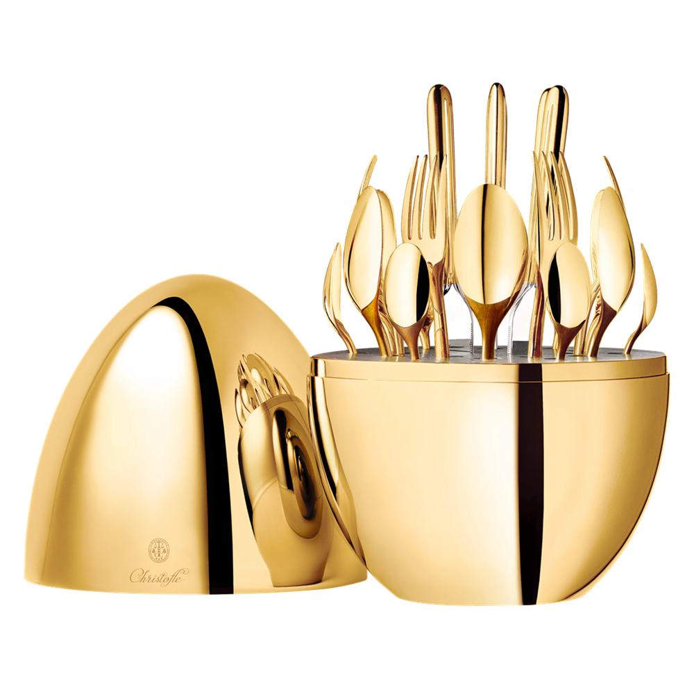 Encased in an egg-shaped chest finished in gleaming gold, the set brings sculptural beauty to the table. Lift the polished lid to reveal a walnut-wood interior holding a complete service for six — six knives, six forks, six tablespoons, and six coffee spoons — each piece meticulously balanced for perfect comfort and poise.