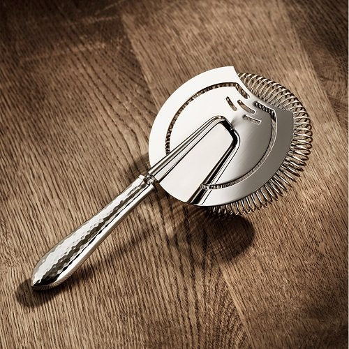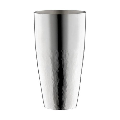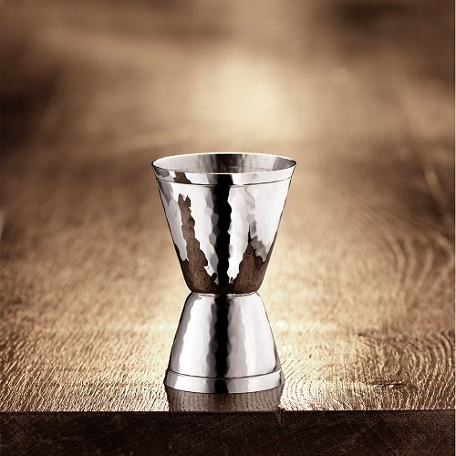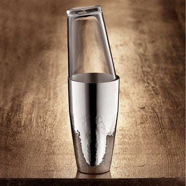 The cocktail shaker is plated 36 microns of silver (90g silver plate) and hammer-finished by hand. The shaker is made to fit the glass perfectly.