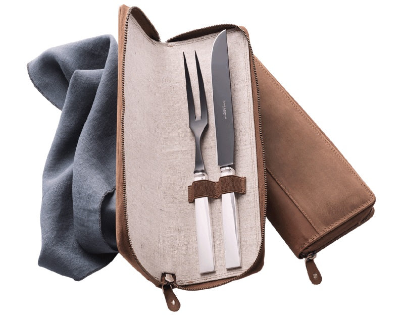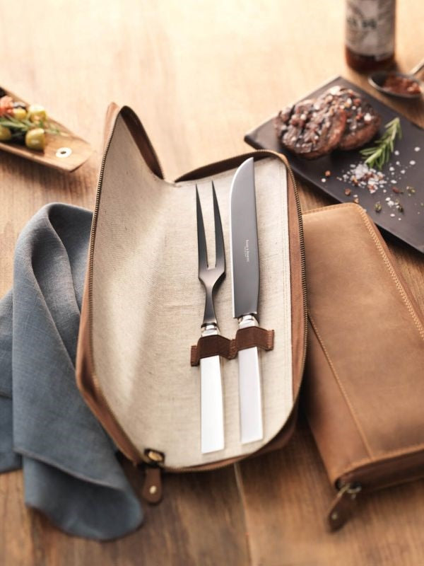 The carving knife, measuring 29.3cm, and the elegant fork at 25.0cm, come nestled in a supple leather bag—a testament to Robbe & Berking’s legacy of excellence.