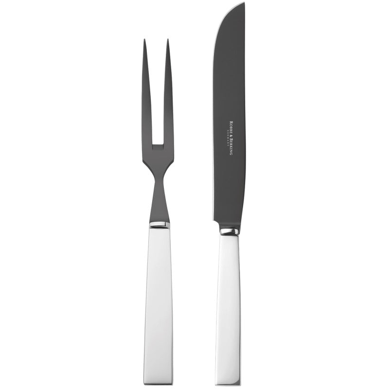 Elevate your dining experience with the exquisite Riva “Frozen Black” Carving Set. Crafted by the renowned silver manufacturer, Robbe & Berking, this set embodies timeless elegance and precision craftsmanship.