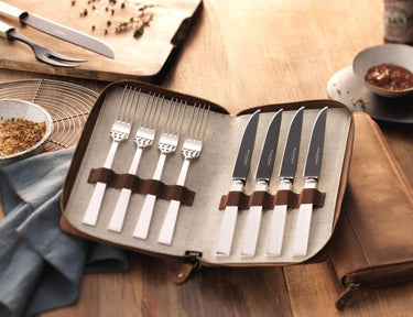 - Handmade in Germany, the set includes 4 steak knives and 4 forks, elegantly presented in a leather bag.