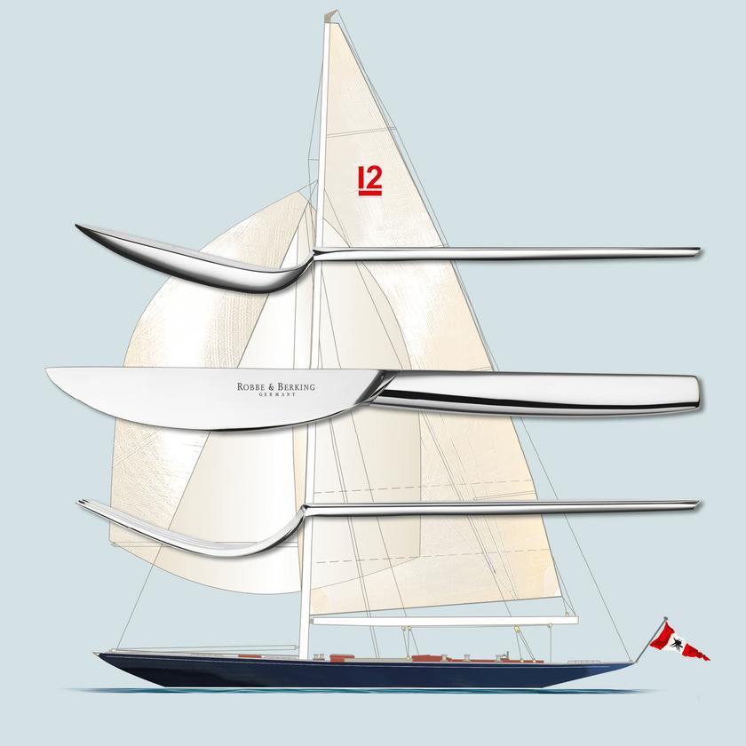 Introducing the captivating 12" silver plated cutlery by Robbe & Berking, a masterpiece crafted by the talented designer Daniel Eltner. Inspired by the rich heritage of Robbe & Berking's own shipyard, where 12m yachts are meticulously restored to their original splendour, the 12" collection captures the essence of the beauty of sailing.