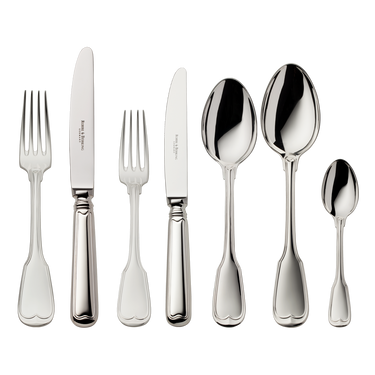 The enduring charm of Alt-Faden cutlery effortlessly blends with both classic and modern table settings. Its generous shape is accentuated by a raised triple thread that elegantly finishes at the tip of the spoon and fork handles, exuding a sense of understated luxury.