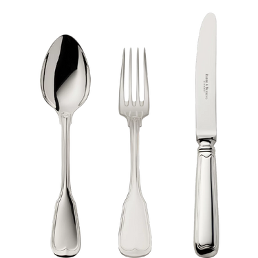 The enduring charm of Alt-Faden cutlery effortlessly blends with both classic and modern table settings. Its generous shape is accentuated by a raised triple thread that elegantly finishes at the tip of the spoon and fork handles, exuding a sense of understated luxury.