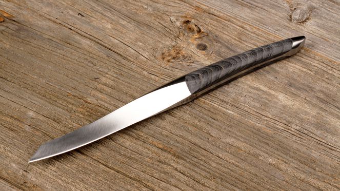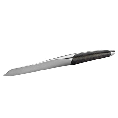Steak Knife Black Ash. The steak knife is a handcrafted masterpiece. The blade of the thought out design of the steak knife is contactless on the table. The noble handle made of stabilized wood makes it an eye-catcher on every table.