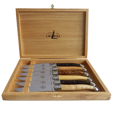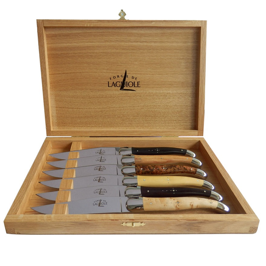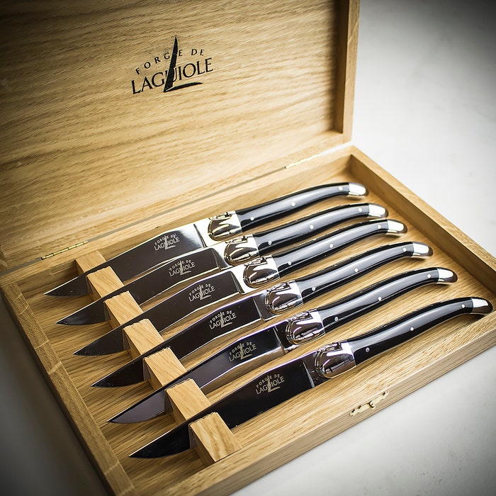 Handmade from oak in the Aubrac region of France, this smart wood case from Forge de Laguiole is the perfect place to store your beloved Forge steak knives.